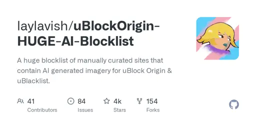 GitHub - laylavish/uBlockOrigin-HUGE-AI-Blocklist: A huge blocklist of manually curated sites that contain AI generated imagery for uBlock Origin & uBlacklist.