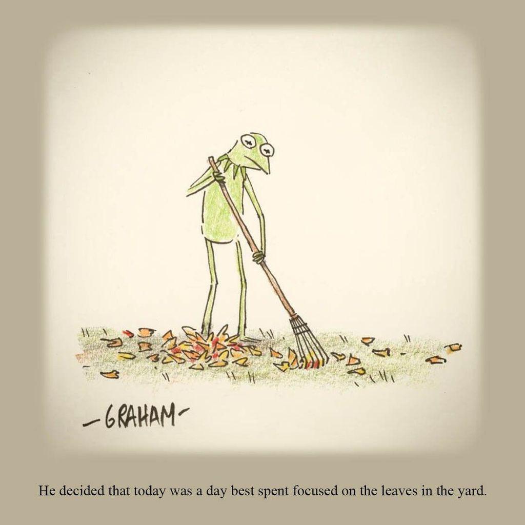 Alt Text: A cartoon illustration of Kermit quietly raking up fallen leaves outside. Caption reads "He decided that today was a day best spent focused on the leaves in the yard."