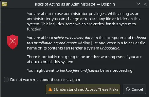 Iirc before dolphin would just refuse to run as root, I guess this is an improvement