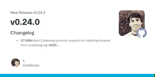 Opensource @programming.dev lens0021 @programming.dev 4w ago bin - Effortless binary manager now supports Codeberg github.com Release v0.24.0 · marcosnils/bin