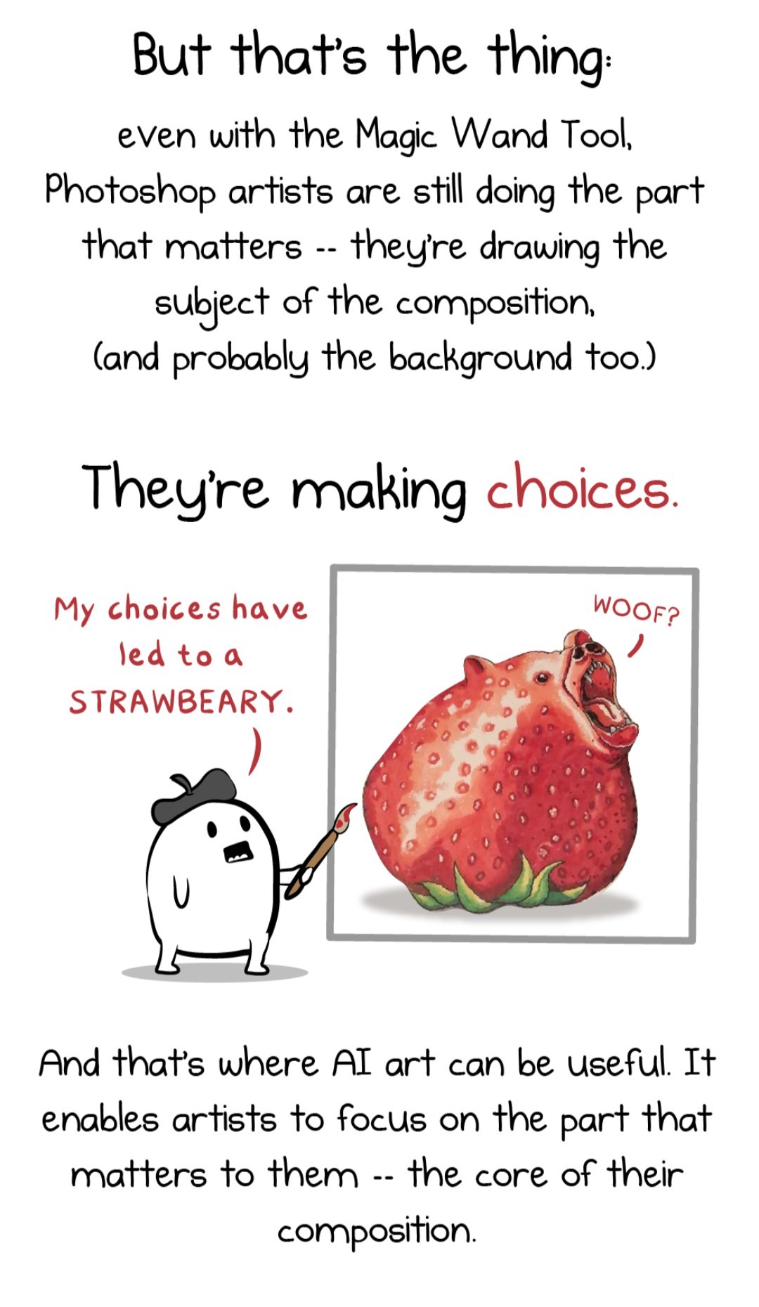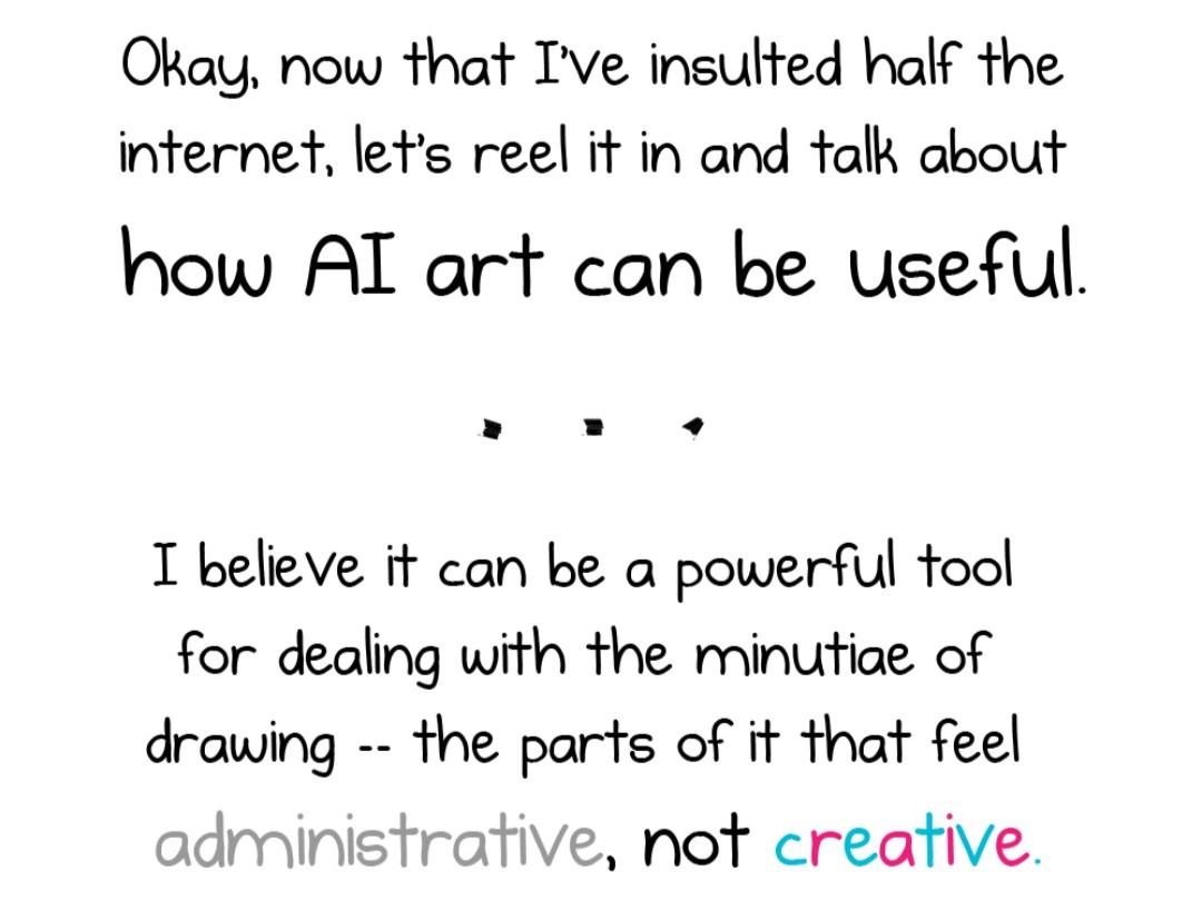 The Oatmeal seems to insist that while AI is helpful to eliminate the boring tasks, art is still a product of effort and struggle. They even later make an argument that these "boring, administrative" tasks might be an important part of creative process, that taking it away means taking something away from the art itself.