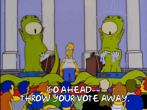 Funny, and promoting the wrong idea. "Tactical voting" is the bane of democracy. If you're against "third parties" you are, fundamentally, against choice and thus democracy.