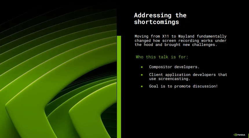 In addition to showing the need for unifying DRM driver-side APIs within the Linux kernel, NVIDIA's Linux graphics driver team at XDC2025 also showcased the shortcomings of screencasting under Wayland.