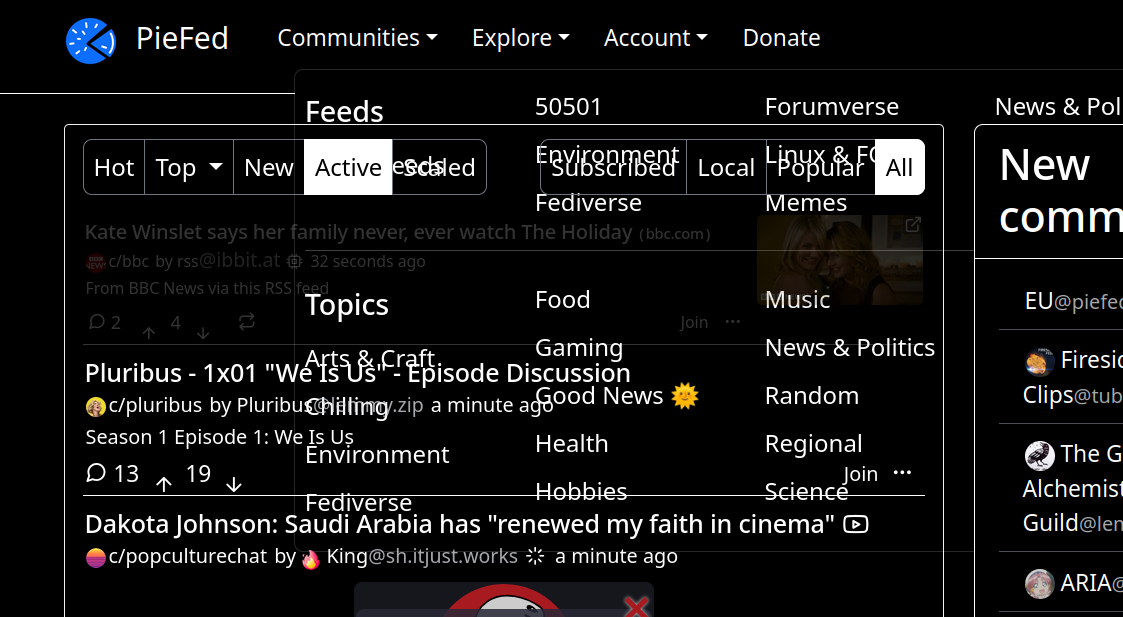 So I have seen this for awhile and had not mentioned something before partially because its not a game stopper and so many things are going on with piefed dev I hated to bother. I kinda expected other people would be seeing it and it would likely get attention and maybe it has but I just have not seen it. Anyway I attached a screenshot showing how the dropdown menus get obscured by the site and its not just obscured because the site under the dropdown seems to have interaction priority. The funny thing is when I click on images and get the larger version like sometimes something like this happens and at other times the pop up image will correctly be in front of everything. Im not sure if its the type of image or what but the effect does not always happen with pop up image. It basically always happens with the drop downs though. I changed to default theme and some other themes and this issue consistantly happens.