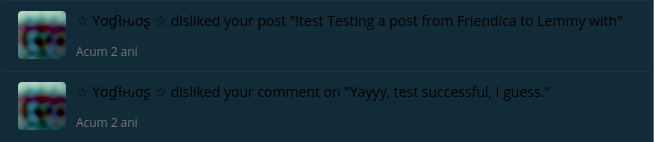 Just like Facebook, Friendica also has a sort of activity center where you can see all previous notifications. It was ~2 years ago when I first discovered Lemmy. Back then, .ml was the most active instance, with Beehaw on the rise as well. I remember I started by posting in non-political communities at first, and nothing bad happened. But the moment I started to show them how brainwashed I was by Western Imperialist propaganda (sic), they immediately resorted to downvoting all my posts and comments like crazy - be them political or not. Below there's a screenshot with my beloved Russian Government shill living somewhere in the West, Yogthos gave me a downvote (dislike) to a post I did in a test community. Don't even know why they bothered, since neither Lemmy and especially Friendica do not have imaginary points for activities on posts and comments. But there's that, lol.