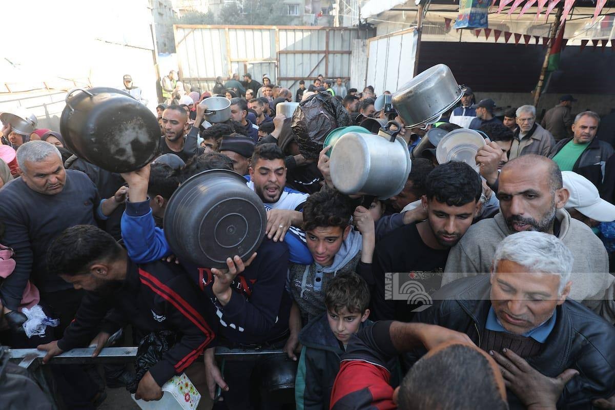 Gaza - Displaced families gather to receive free meals from a charity kitchen in the Nuseirat refugee camp, amid the suspension of operations by many humanitarian organizations due to Israeli