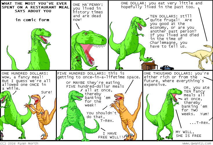 InitialsDiceBearhttps://github.com/dicebear/dicebearhttps://creativecommons.org/publicdomain/zero/1.0/„Initials” (https://github.com/dicebear/dicebear) by „DiceBear”, licensed under „CC0 1.0” (https://creativecommons.org/publicdomain/zero/1.0/)N NPCs (NonPolitical Comics) @piefed.social Auster @thebrainbin.org 2mo ago Dinosaur Comics January 19th, 2026 SourceAlt text some days you just want to write a comic that will become instantly dated. greetings, future readers - remember when spending more than $100 on eating out was REMARKABLE??
