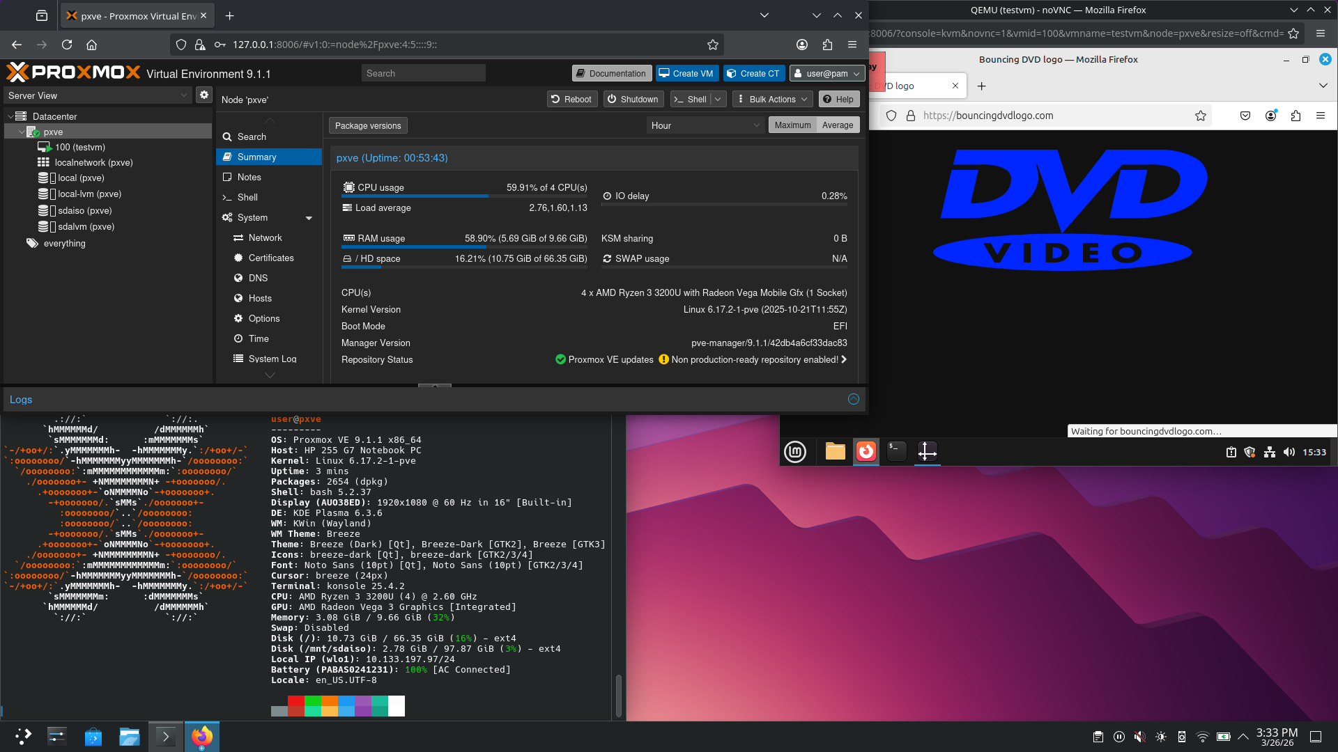 Cursed setup - Proxmox VE on a laptop, with KDE Plasma on top of it.