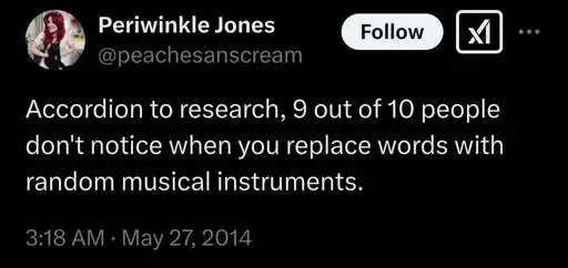 When seeing this post and all the comments that continue the joke, the first thing i read is the musical instrument. I look at the text, see the replaced word and then go to the first word to actually read it