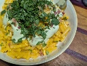 Box mac and cheese with jalapeno cream sauce, bacon and cilantro.
