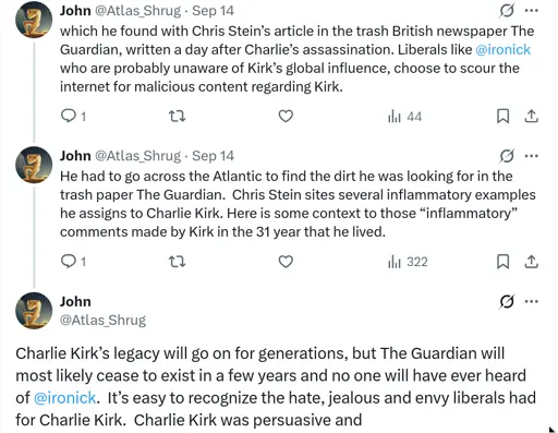 John thinks The Guardian is an evil newspaper. He gets his knowledge from Fox News (Rupert Murdoch), the New York Post (Rupert Murdoch) and WSJ (Rupert Murdoch)