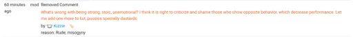 Pussy word is used for men who lacks daring in reasonable situations. I don't see how it is rude & misogynistic? Probably they are sexist if they think woman can not be unemotional, stoic, strong and courageous.