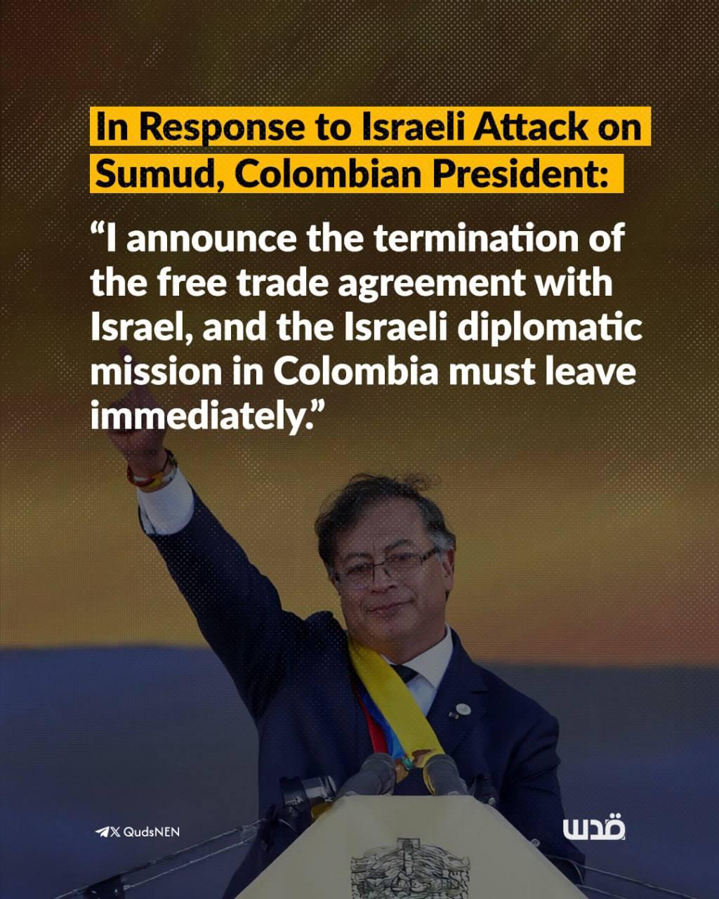 Colombian President Gustavo Petro announces concrete steps in response to Israel's attack on Global Sumud Flotilla vessels.