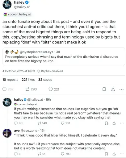 i think it sucks that we're stuck with, say, bluesky engineers genuinely trying to pull the most moronic variant of "but what if the stochastic text generator might have feelings in the future too", but we still need to be able to talk about why people feel the need to make "clanka with the hard r" jokes (answer it's racism)