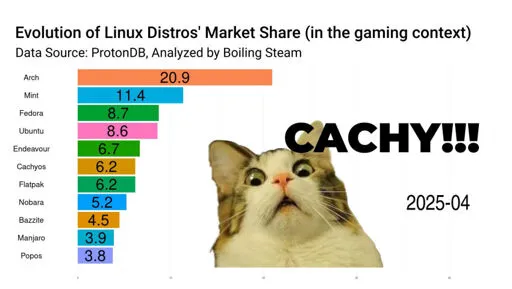 Oh, and i'm pretty sure I know where flatpak is from. The instructions to input your system data in ProtonDB relies on steam's system information. My OS shows as flatpak by default because I installed a flatpak version of steam from the pop shop. If someone doesn't manipulate it themselves, it shows as "OS: Freedesktop SDK 25.08 (Flatpak runtime)" - The most recent data shows flatpak as 4.5%. So who knows where those users really are coming from. Cachyos ships with steam, so it won't ever show up as flatpak for that OS unless someone does something really funky.