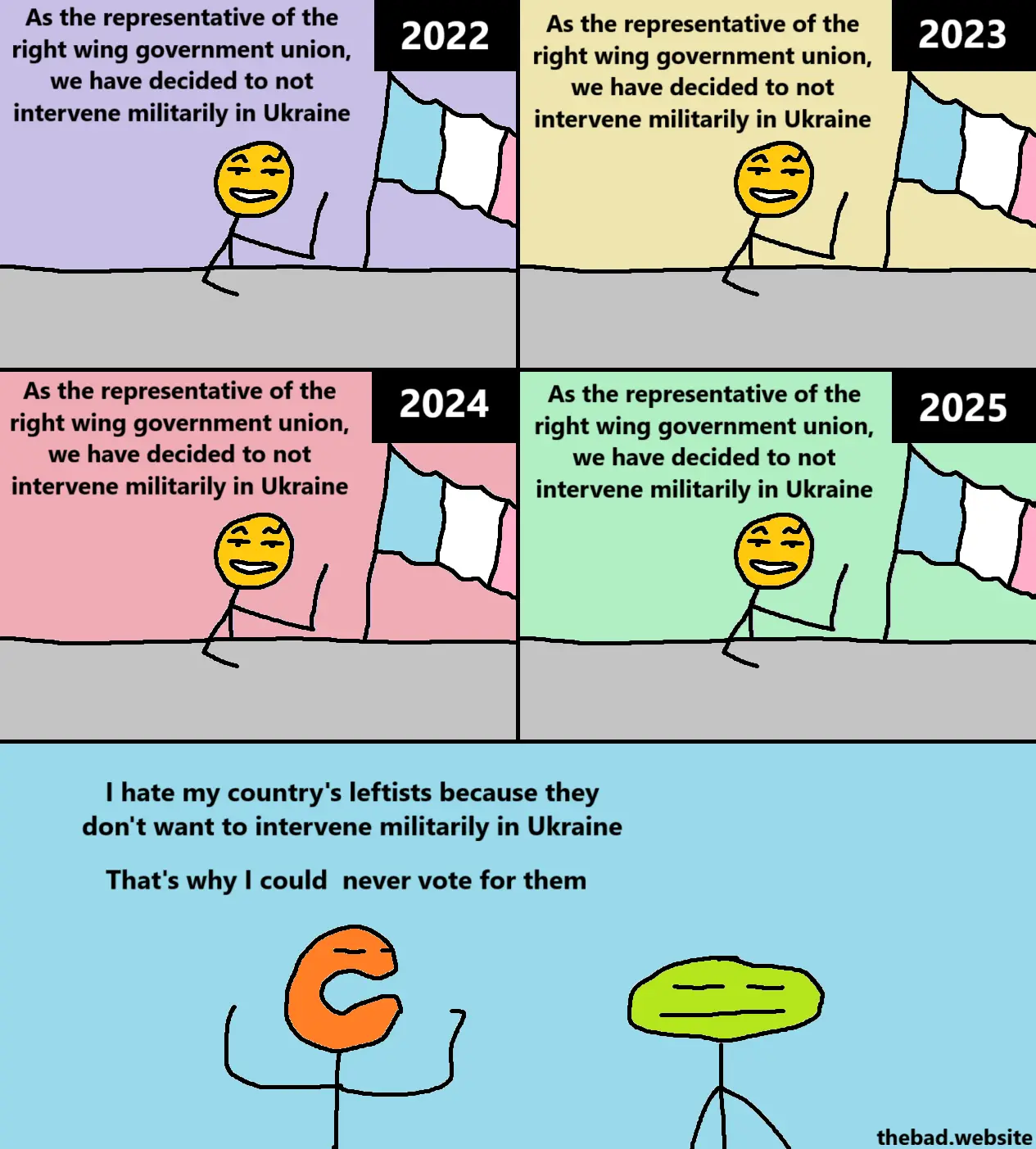 [orange, angry] I hate my country's leftists because they don't want to intervene militarily in Ukraine That's why I could never vote for them