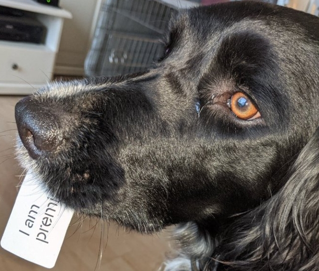 header is een foto van mijn hond luna die een etiket in haar mond heeft met de tekst 'i am premium'
