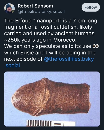 Screenshot of a Bluesky post of a fossilized cuttlefish that looks like a dickhead and part of a shaft. The scientist claims it was carried around by prehistoric humans 250,000 years ago and we don't know why, but they will talk about why in an episode of the podcast The Fossil Files