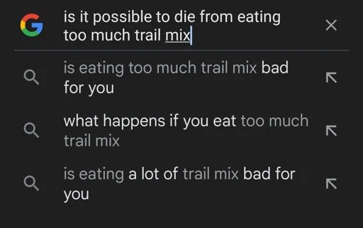 A screenshot of a Google search with the text "is it possible to die from eating too much trail mix" followed by several search suggestions.