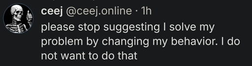 Post on Bluesky that says, "please stop suggesting I solve my problem by changing my behavior. I do not want to do that."
