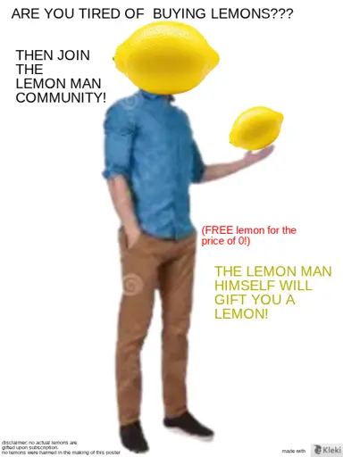 sorry for shitposting so much today I'm bored :| url to the lemon man community if you'd want to join: https://lemmy.world/c/thelemonman